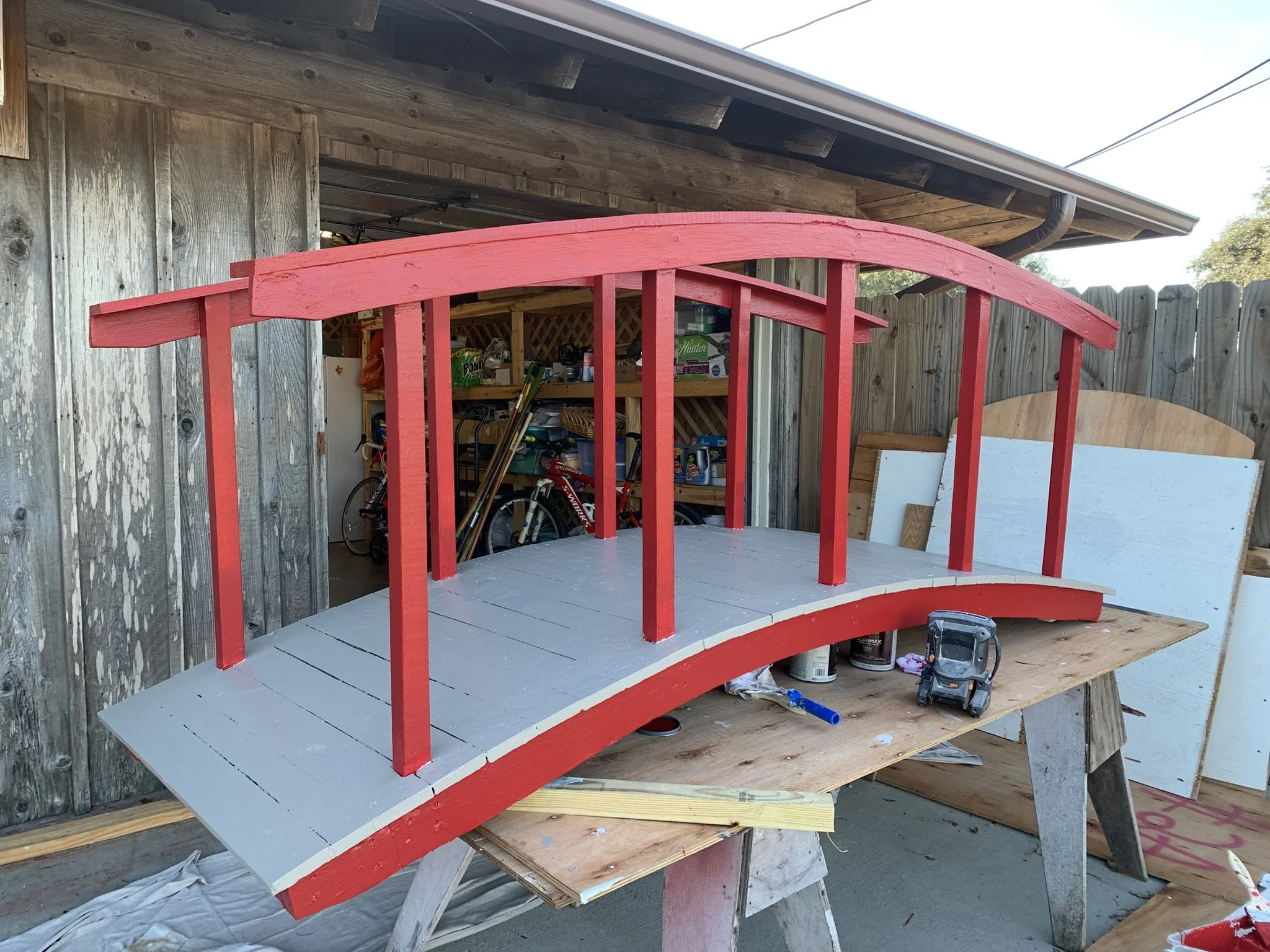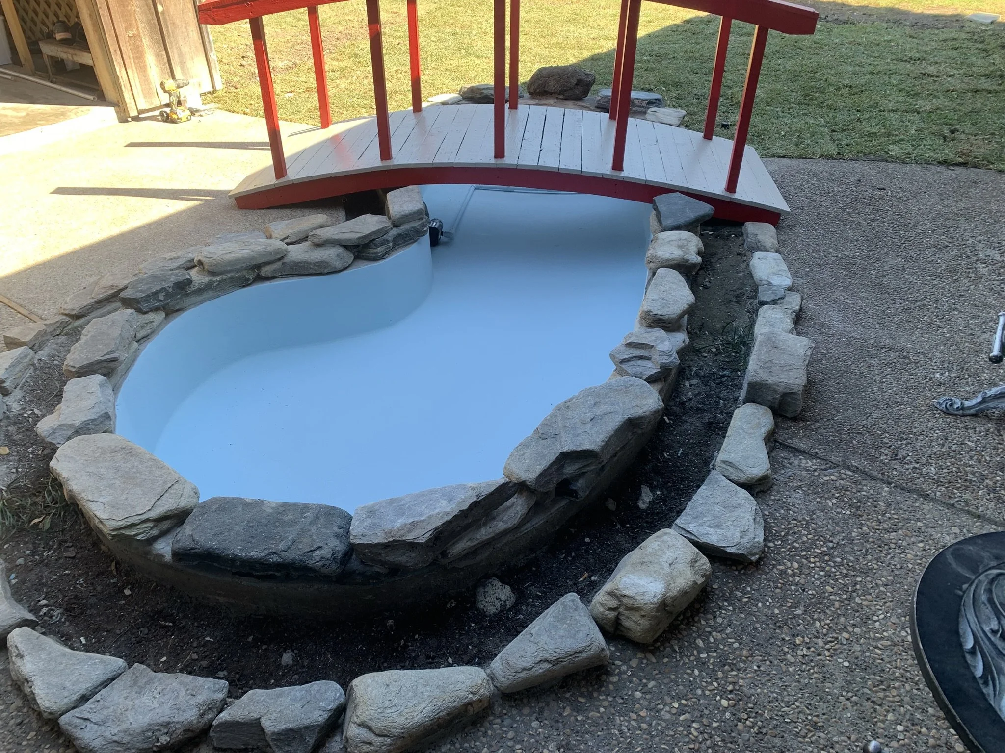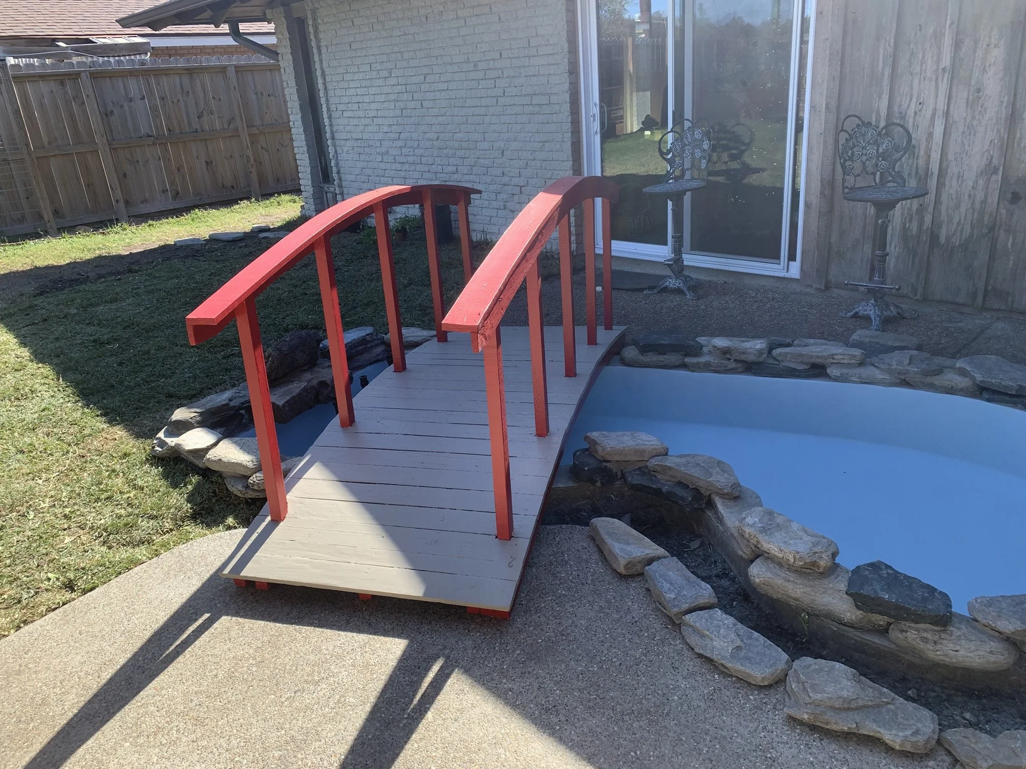 This multi-phase remodel brought a creative and tranquil backyard vision to life. We started by prepping and forming a new concrete section near an existing pool area, improving both the layout and flow of the space. A custom arched wooden bridge was restored, blending craftsmanship and bold design with a red and gray finish that adds visual impact.