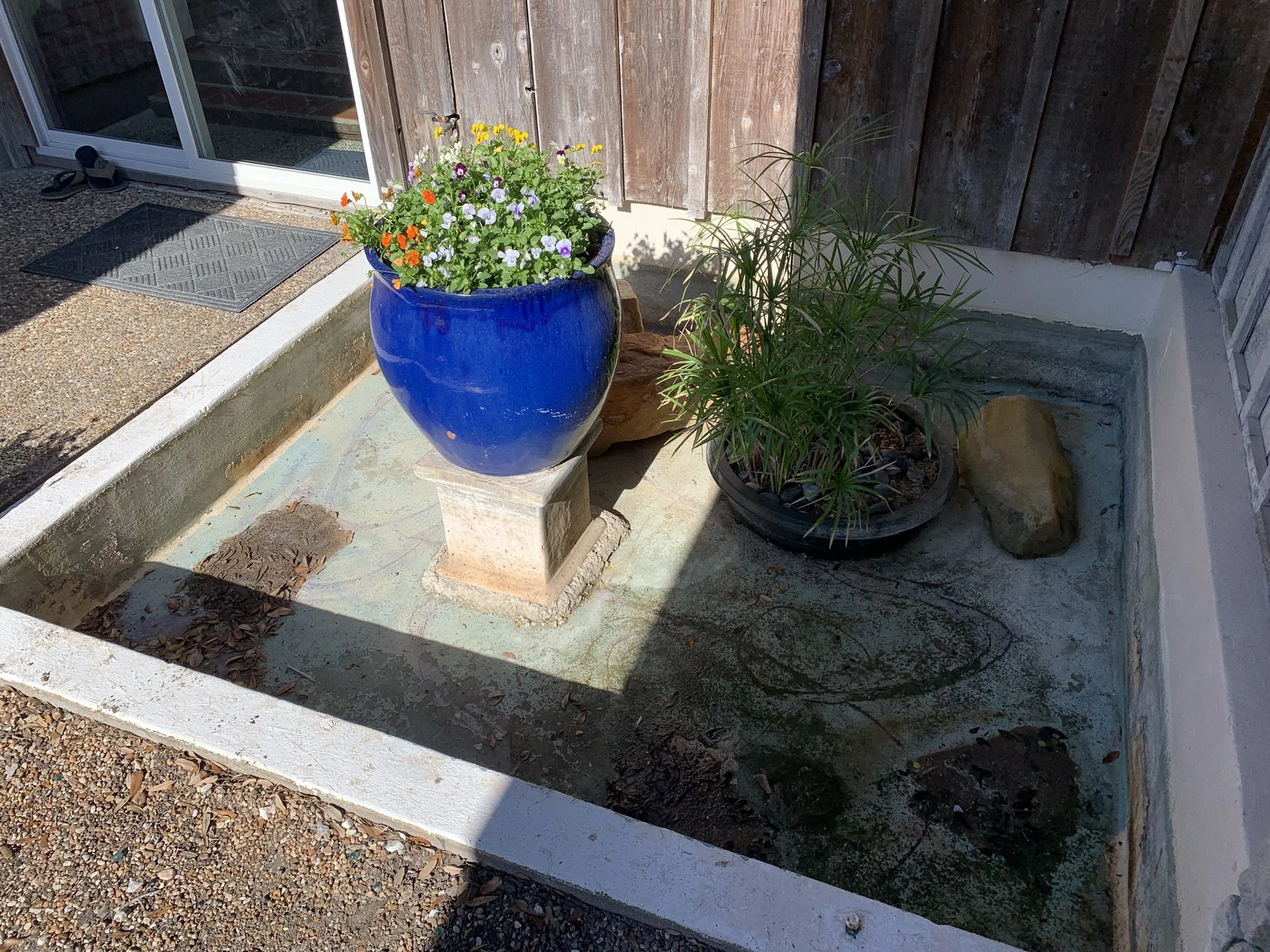 The backyard pond was fully restored — cleaned, sealed, and brought back to life with a working fountain system and new decorative stonework. We also refreshed surrounding landscaping and upgraded the entryway with fresh touches for better curb appeal.